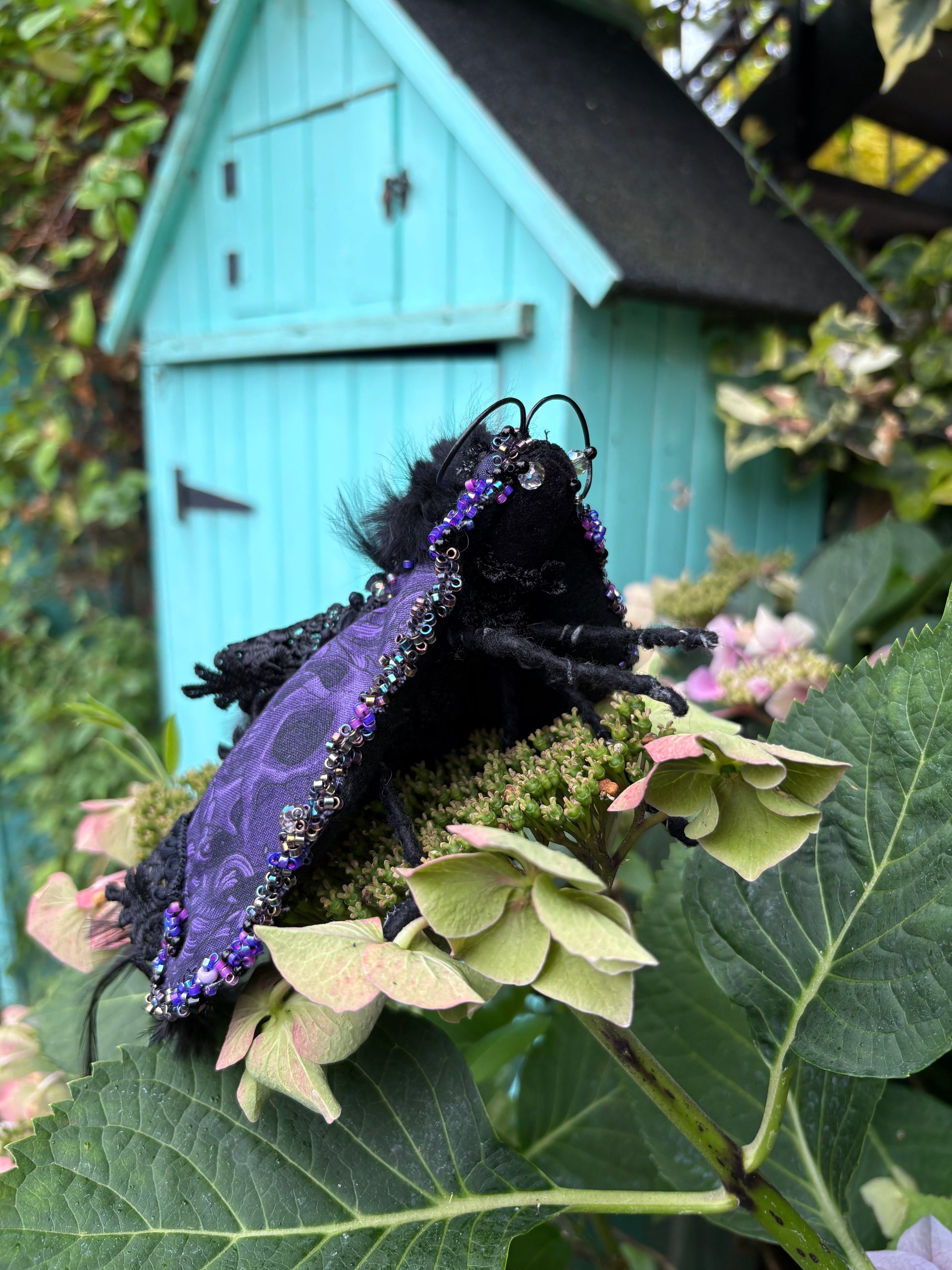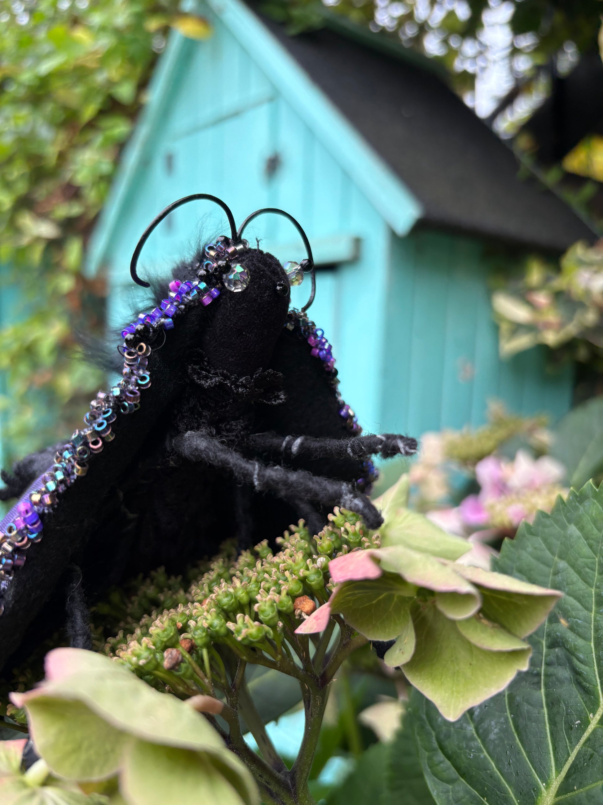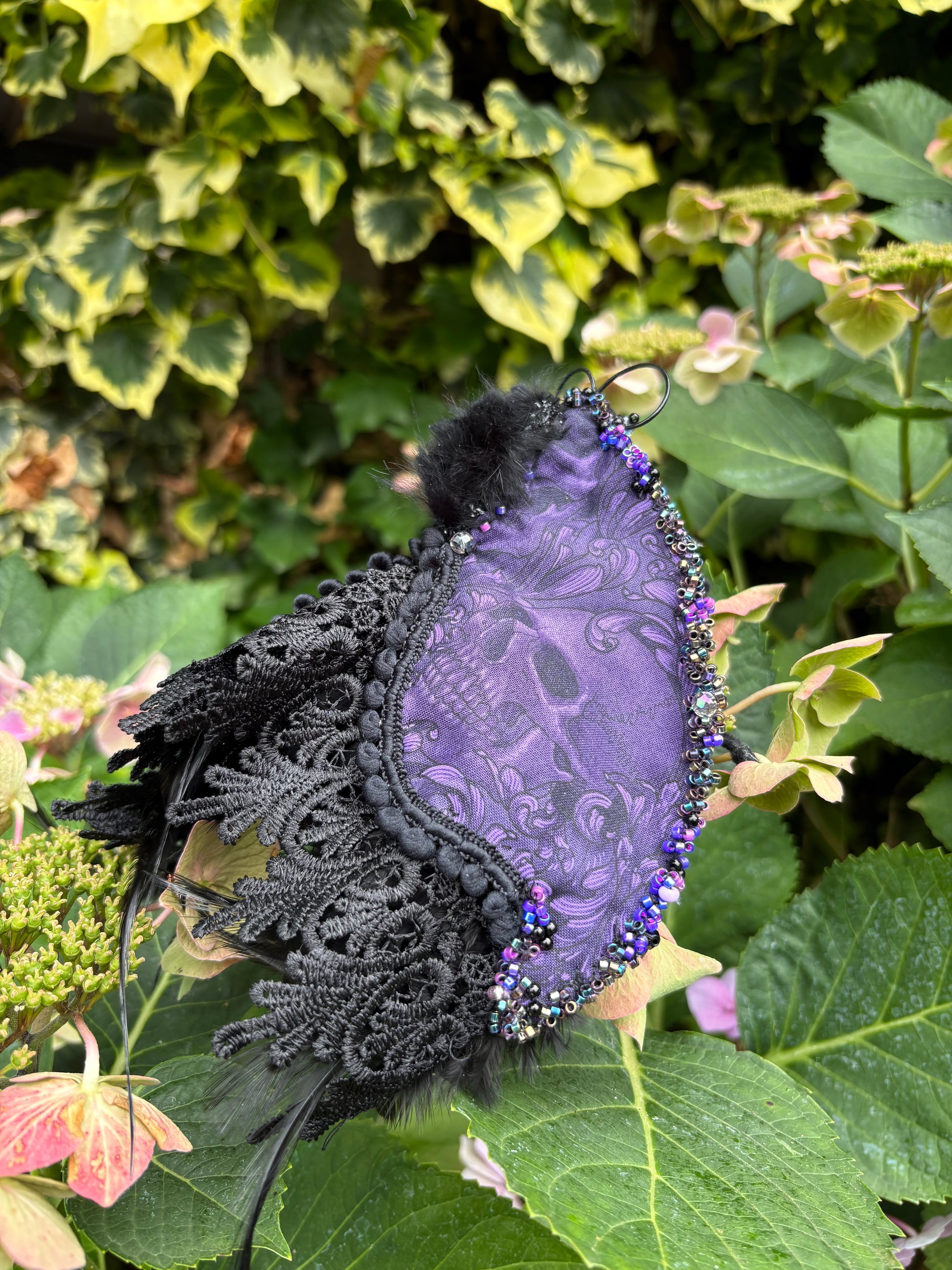 With gothic skull fabric, felt wrapped wire legs, lace, feathers and a velvet body, she’s luxury!