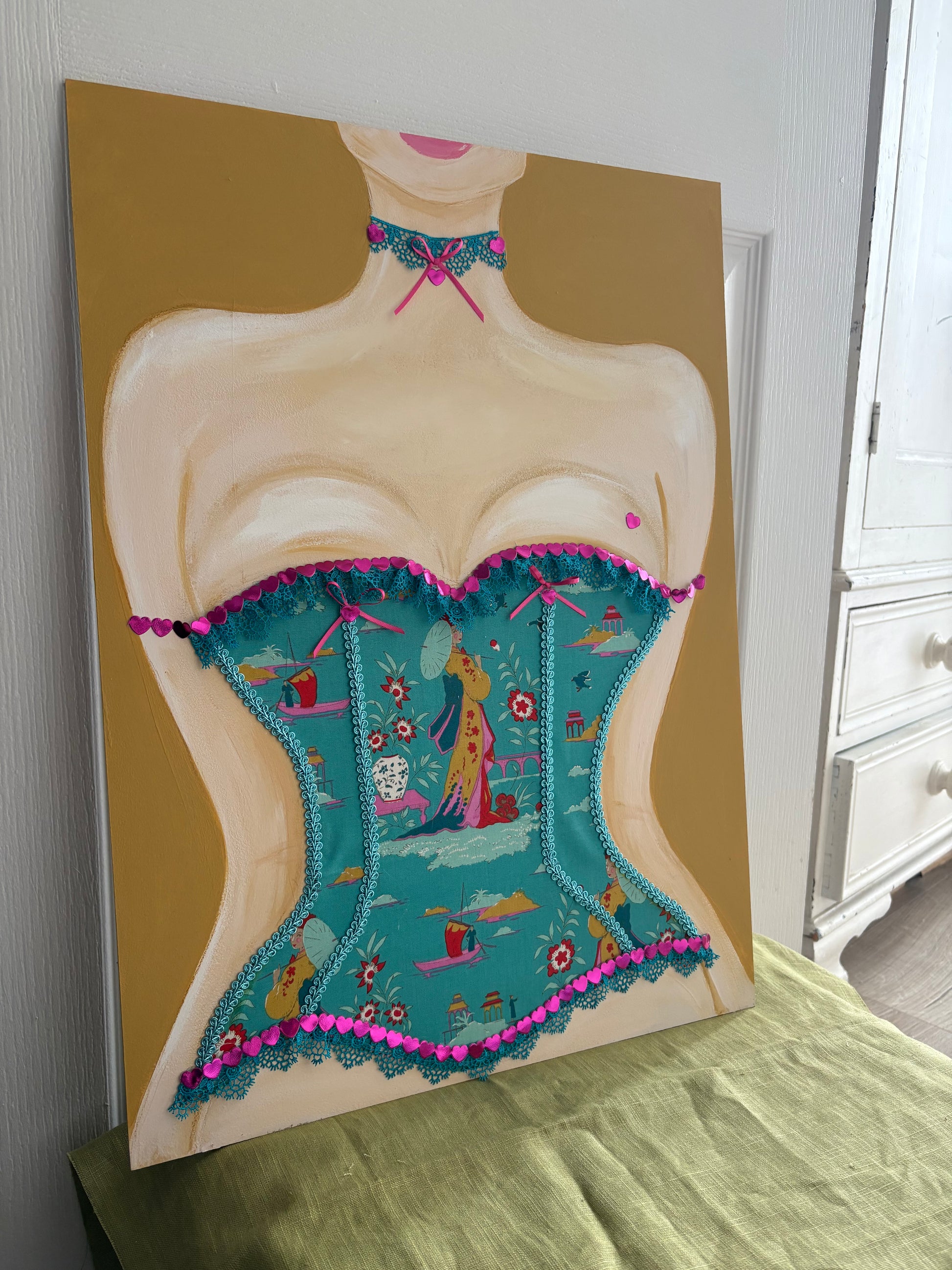 Sporting a Tilda fabric bustier with a delicate pink heart trim and a matching choker necklace, our Tilda Beau Bouffant will certainly add a touch of playful intrigue to your home or studio.
